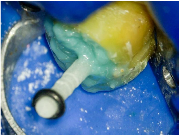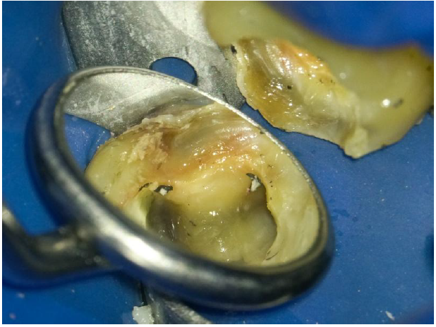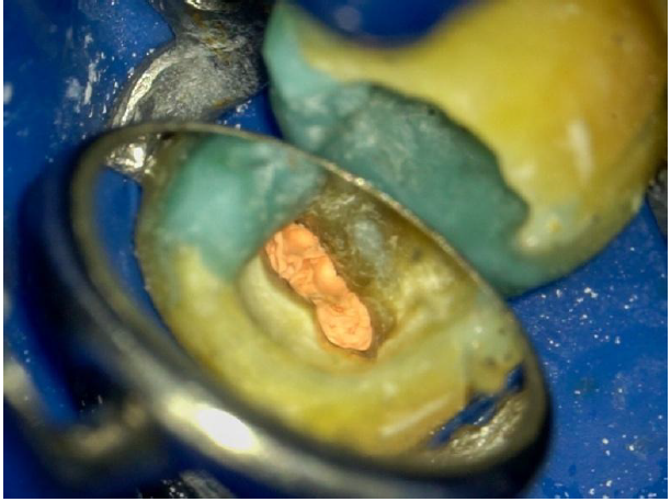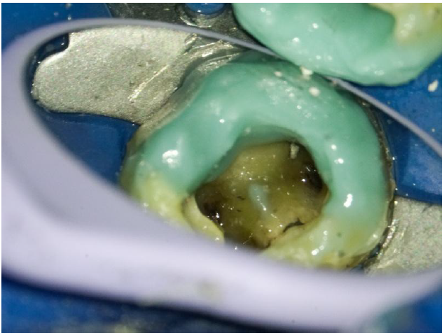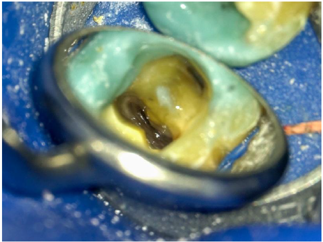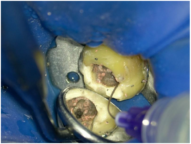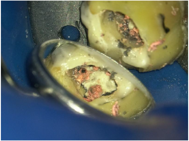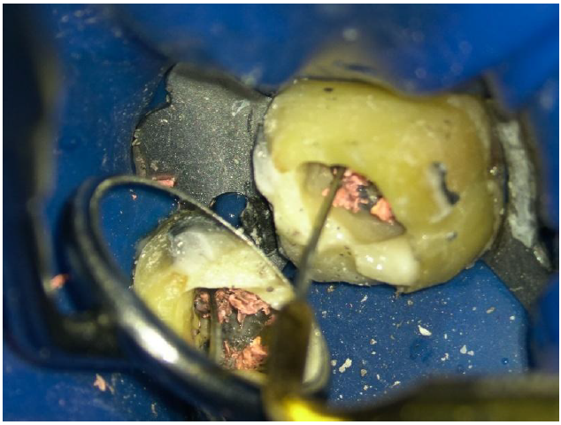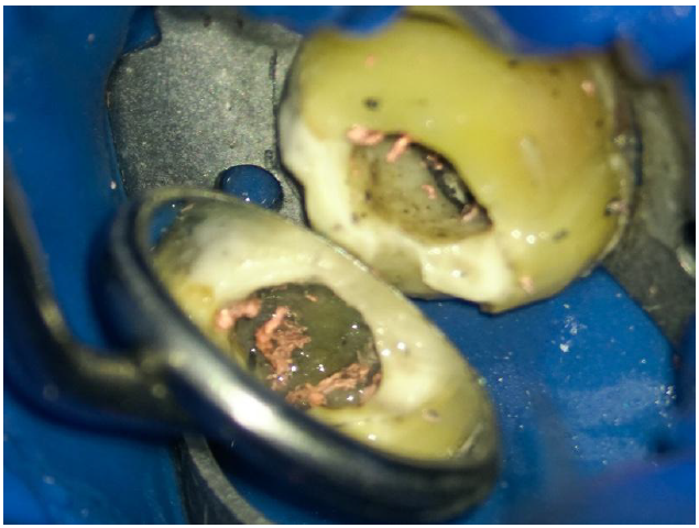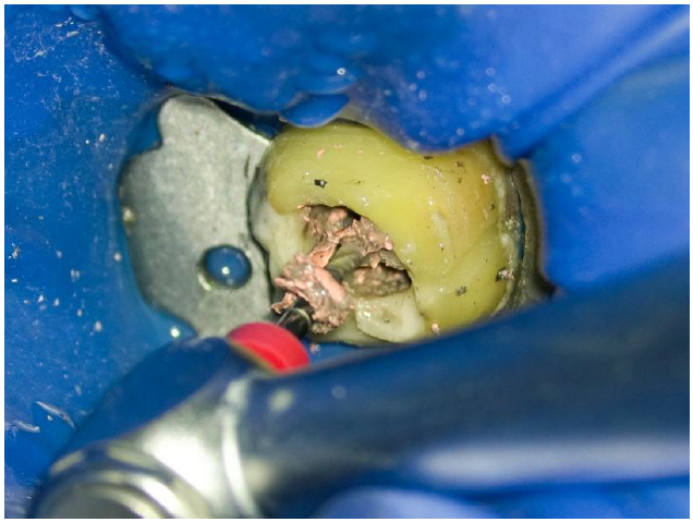 All existing composite restorations were removed to assess underlying structural integrity. Extensive decay was found beneath the lingual composite wall, which was subsequently restored using a contrast shade core build-up (Encore DC MiniMix) with a dual-cure adhesive (Connexio). Due to time constraints, calcium hydroxide was placed as an intracanal medicament before final obturation.