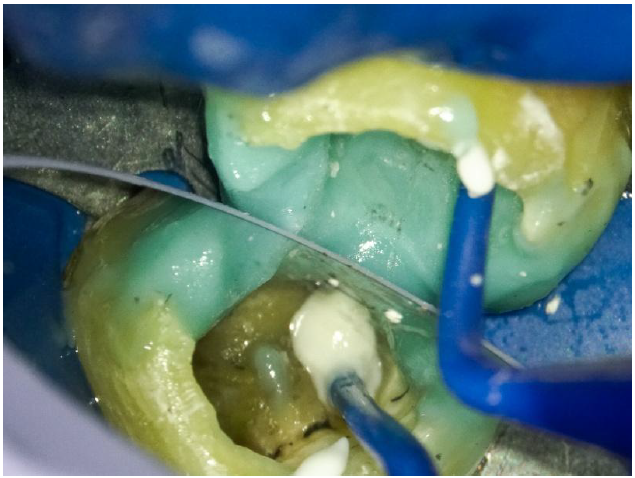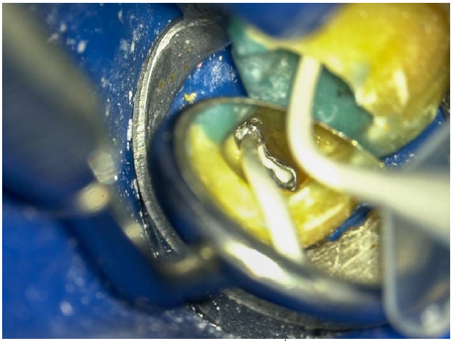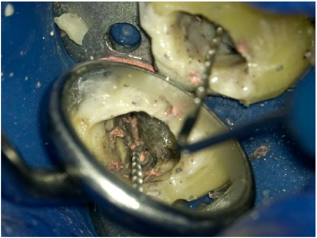 Following removal of the existing crown on tooth 47, retreatment was initiated using the Neoniti C1 file (450 RPM, 2.5 N·cm) and ultrasonic instruments to begin gutta-percha removal. The consistency of the gutta-percha resembled plastic, necessitating the use of Neolix files, which performed exceptionally in this scenario.