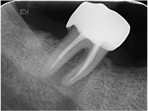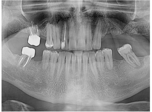 A 52-year-old male patient presented in 2021 with acute, severe pain localized to tooth 47 (mandibular right second molar). Clinical and radiographic examination revealed a large periapical lesion at tooth 47, despite the presence of a previous root canal treatment, and a compromised tooth 16 with extensive structural loss, subgingival decay, and perforation.